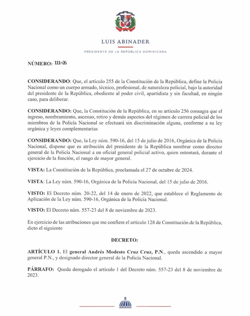 El presidente de la República Dominicana, Luis Abinader, designó al mayor general Andrés Modesto Cruz Cruz como nuevo director general de la Policía Nacional, mediante el decreto número 111-26.