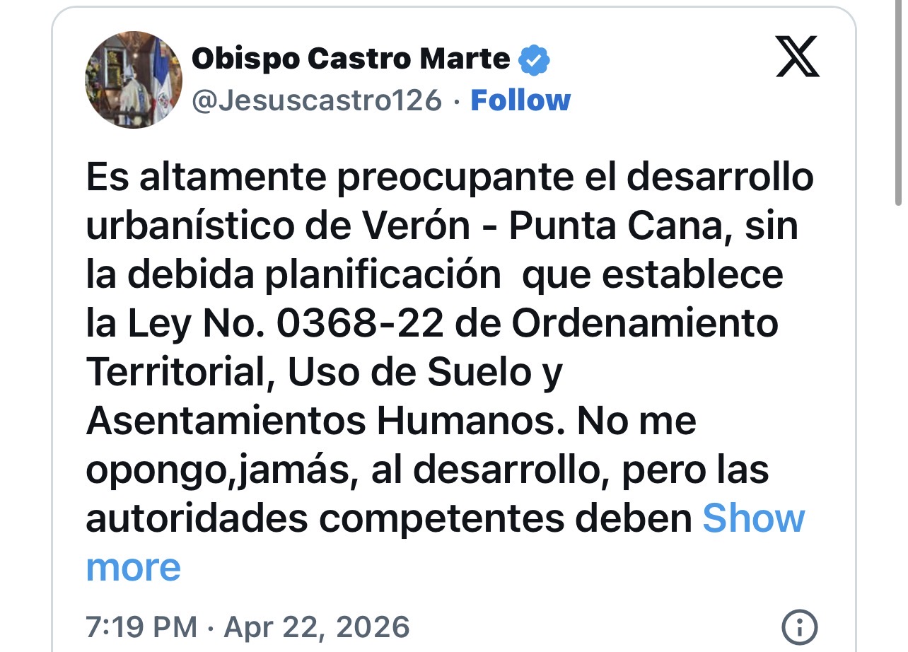 La Altagracia.-.El obispo de la Diócesis de Nuestra Señora de la Altagracia, Jesús Castro Marte, expresó este jueves su preocupación por el crecimiento urbanístico de Verón-Punta Cana, al considerar que se desarrolla sin la debida planificación contemplada en la Ley No. 368-22 sobre Ordenamiento Territorial, Uso de Suelo y Asentamientos Humanos.