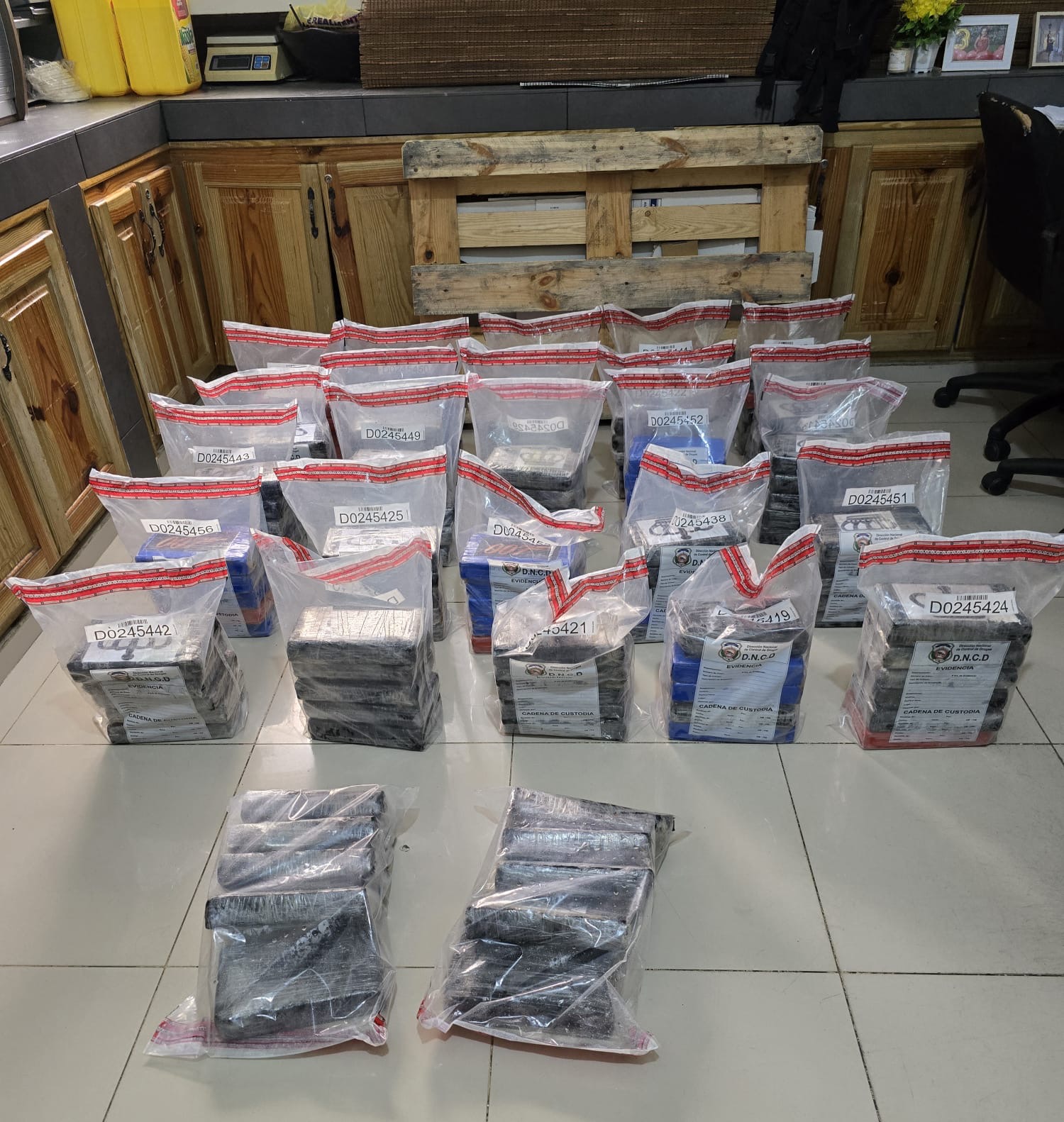 Los 136 paquetes de la presunta droga fueron enviados bajo cadena de custodia al Instituto Nacional de Ciencias Forenses (INACIF) para determinar el tipo y el peso exacto del cargamento.